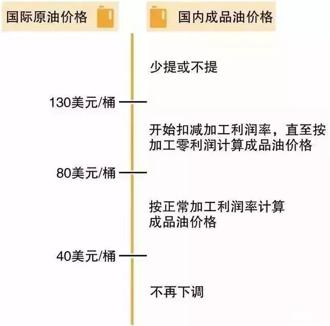 规则:根据国际市场原油价格,我国的成品油价格进行调整。当调价幅度低于每吨50元时,不作调整,纳入下次调价时累加或冲抵。调控设置有上下限:上限为130美元/桶,下限为40美元/桶。
