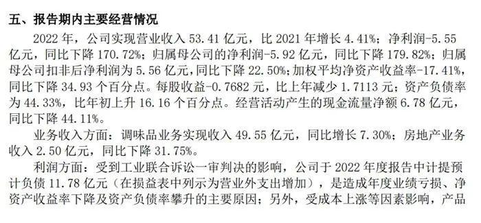 据中炬高新2022年年度报告显示,2022年,公司实现营业收入53.41亿元,比2021年增长4.41%;净利润-5.55亿元,同比下降170.72%;归属母公司的净利润-5.92 亿元,同比下降 179.82%。