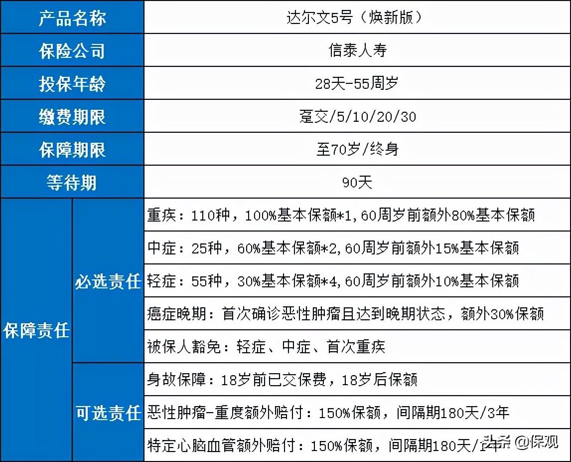 比如信泰人寿的达尔文5号焕新版,保障含重度阿尔茨海默病在内的110种重疾,赔付100%基本保额,60岁前还额外赔付80%基本保额,一旦确诊,保险公司则会一次性赔付一笔保额,用于药物费用或照顾患者的费用。但赔付条件是被保人已经完全丧失自主生活能力,无法独立完成穿衣、移动、行动、如厕、进食、洗澡六项基本日常生活活动中的三项,并且日常生活必须持续受到他人监护。