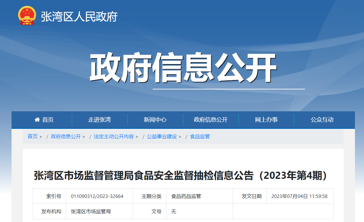 中国质量新闻网讯 据湖北省十堰市张湾区人民政府网站2023年7月4日消息,湖北省十堰市张湾区市场监督管理局发布食品安全监督抽检信息公告(2023年第4期)。