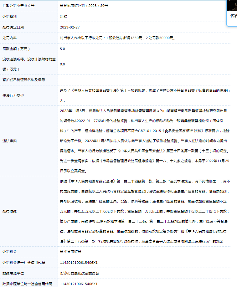 2月27日,长沙县市监局作出长县执市监处罚﹝2023﹞39号处罚决定书。信用中国(湖南)官网载明:湖南养益君生物科技有限公司因生产的标称名称为“玫瑰桑葚破壁植物饮(固体饮料)”的产品,经抽样检验,菌落总数项目不符合GB7101-2015《食品安全国家标准 饮料》标准要求,检验结论为不合格,依据《中华人民共和国食品安全法》第一百二十四条第一款、第二款,处罚款5万元。