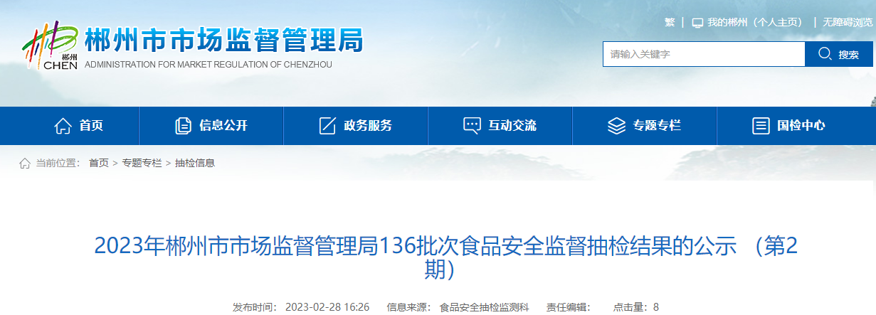 中国质量新闻网讯 2023年2月28日,湖南省郴州市市场监督管理局网站公示136批次食品安全监督抽检结果。