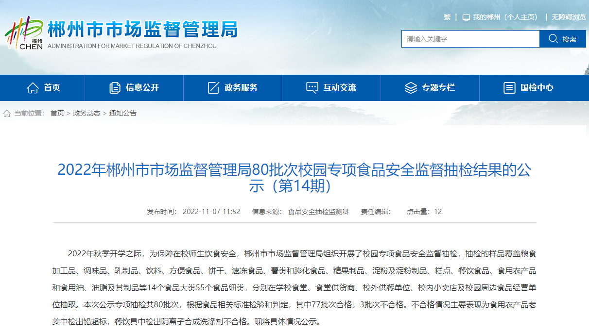 中国质量新闻网讯 近日,湖南省郴州市市场监督管理局发布《2022年郴州市市场监督管理局80批次校园专项食品安全监督抽检结果的公示(第14期)》。