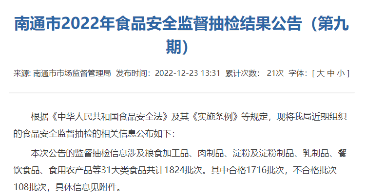 中国质量新闻网讯 近日,江苏省南通市市场监督管理局发布南通市2022年食品安全监督抽检结果公告(第九期)。